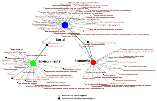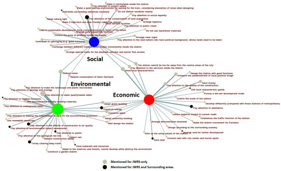 With regard to the surrounding areas of the JWRS, three ideas stand out, i.e., ‘arrange good affiliate facilities’ (nine calls), ‘pay attention to plants’ (seven calls) and ‘distribute surrounding industries rationally’ (six calls). These ideas clearly pertain to improving the surrounding areas (with green plants and facilities that serve social and economic functions). In contrast to the ideas of the railway station, these ideas were more interdependent between sustainability dimensions.