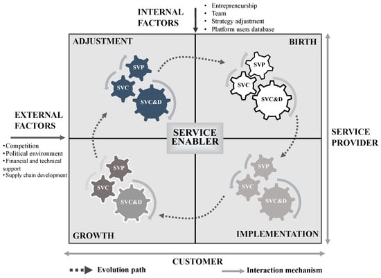 SKN has managed to assemble a large userbase, incorporating an impressive number of architectural design institutes and designers and transforming from a start-up into a sustainable business in China. Our analysis of SKN indicates that SBM innovation in the context of a sharing economy platform is a dynamic evolution process that consists of four phases: the birth, implementation, growth, and adjustment of the platform (as shown in