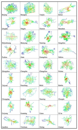 The results of the main syntactic indicators of the road networks of the 36 major cities in China are shown in Table 2. Given a large amount of axis data of the 36 cities, the average of the syntactic indicators was used in the study to represent the level of accessibility in each city. Further, the descriptive statistical values of the 36 city syntax indicators calculated according to data in Table 2 are shown in Table 3. At the same time, according to the numerical value of the Global Integration degree of each road axis, the study used different colors to spatially express it, as shown in Figure 1. The warmer the color was, the greater the Integration value of the road axis was, and the better was the accessibility. Whereas the cooler the color was, the smaller the Integration value of the road axis was, and the worse was the accessibility.