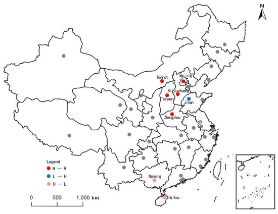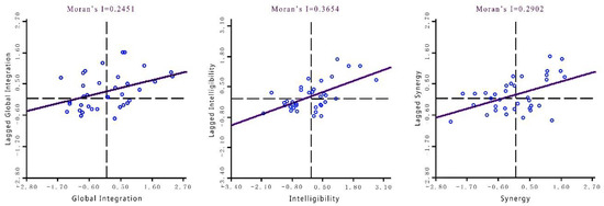 where Ii is the Local Moran’s I index. The other variables have the same meaning as in formula (5). Besides, the significance of spatial autocorrelation can be tested according to the calculated test statistics. The general significance level is 0.05. More detailed principles of Moran’s I index can be found in the related literature [38,39,40] and have not been repeated here. Specifically, the Global Moran’s I index and Local Moran’s I index of each syntactic index value were calculated by using the point data of 36 major cities and the spatial weight method based on distance. The results are shown in Table 6 and Figure 2.
