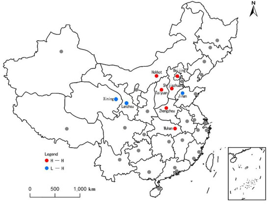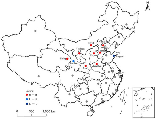 According to Figure 3, Figure 4 and Figure 5, the three syntactic indicators were mainly high-high type in the local spatial agglomeration distribution, showing a distinct spatial pattern of high-value clustering. In terms of Global Integration, there were six cities, including Beijing, Shijiazhuang, Hohhot, Taiyuan, Zhengzhou, and Wuhan in the high-value areas; in terms of Intelligibility, high-value areas included five cities, namely Beijing, Shijiazhuang, Hohhot, Taiyuan, and Zhengzhou. In terms of Synergy, there were eight cities in the high-value areas, including Beijing, Shijiazhuang, Hohhot, Taiyuan, Zhengzhou, Xi’an, Yinchuan, and Xining. On the whole, Beijing, Shijiazhuang, Hohhot, Taiyuan, and Zhengzhou constituted the core area of high-value agglomeration of local spatial autocorrelation. Hohhot, Taiyuan, and Zhengzhou formed the vertical axis from north to south; Taiyuan, Shijiazhuang, and Beijing formed the horizontal axis from west to east. Together, they formed the spatial pattern of the inverted "T" shape.