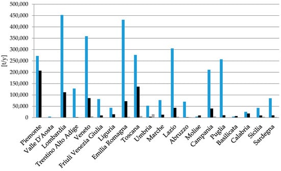 | Emilia Romagna | 173.0 ± 107.9 | 44.3 ± 33.8 | 0.9 ± 2.6 | 0.0 ± 0.0 | 6.9 ± 6.7 | 0.0 ± 0.0 | 127.0 ± 122.5 | 352.1 |