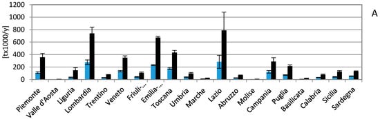 | Friuli Venezia Giulia | 148.2 ± 180.2 | 14.1 ± 10.8 | 0.0 ± 0.0 | 0.0 ± 0.0 | 2.8 ± 2.1 | 0.0 ± 0.0 | 44.0 ± 47.3 | 209.1 |