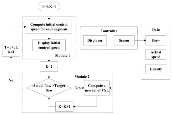 Additionally, to test the effectiveness, the above-mentioned variable speed limit (VSL) control strategies are applied in different control scheme of algorithms, which name the VSL-I and the VSL-II respectively. First, algorithm VSL-I is on the basis of research in [], which considered the fluctuation of approaching traffic demand. The objective of the VSL-I is to minimize the queue length of the work zone, consisting of two modules. As shown in Figure 1, the first module (Module 1) function computes the initial speed of each VSL control stretch. Then, the second module (Module 2) is responsible for updating the control speed in terms of the difference between the detected flow speed and the target control speed over fixed time steps.