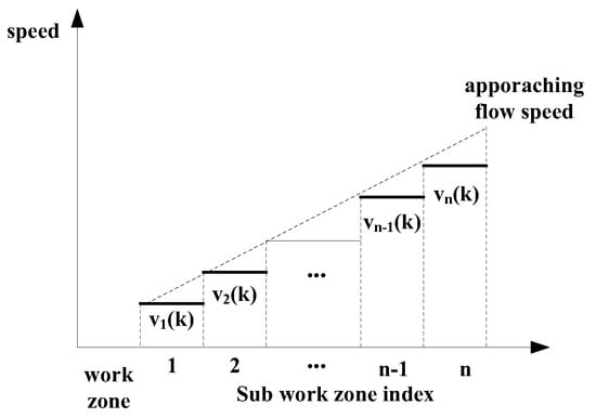 As a kind of well-used and conventional speed limit control strategy, fixed speed limit marks are adopted in our simulated fields. With reference to “Road traffic signs and markings-Part 4 work zone (GB5768.4-2009)” and “Traffic safety signs of road operation (GA182-1998)” in China [,], we determined the laying schemes of the fixed speed limit signs in all the work zones, such as the positions and the boundary ranges of the speed limit values, etc.