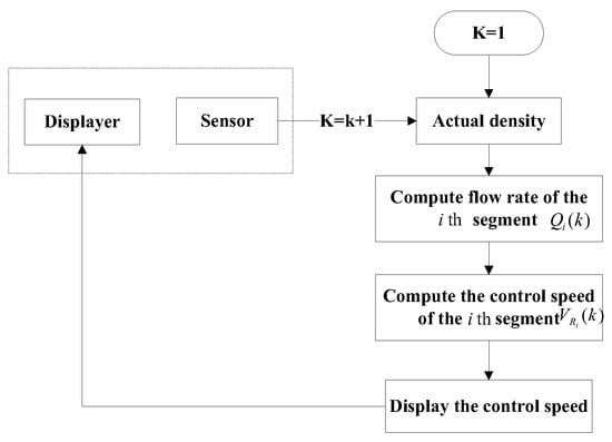 ALINEA, a local feedback ramp-metering strategy control strategy can be considered as one type of VSL control algorithm, proposed by Papageorgiou [], that has proved to be a remarkably simple, efficient and easily implemented method in ramp metering. The logic in ALINEA is to alleviate the gap between the actual detected density and desired density, as shown in Figure 3.