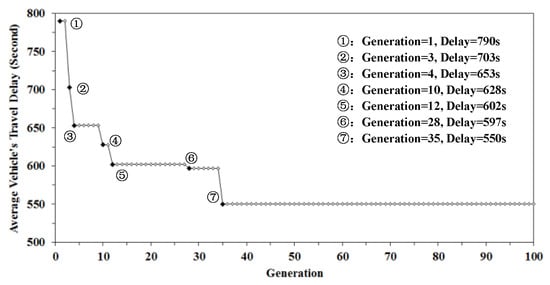 The optimization procedure was processed by the mentioned GA algorithm. The convergence process is shown in Figure 5. Each point in the following figures presents the numbers of generation iteration in the GA algorithm. The calculated progress of the average travel delay presents a staged decreasing trend and becomes stable from the 35th generation. Table 5 displays the variation of global optimal solutions as generation iteration increment. And the convergence results showed the final maintenance schedule was obtained at the 35th generation. In detail, the global optimal solution was not found until 35 iteration times as the average travel delay improved from 790s to 550s compared to the initial scheme.