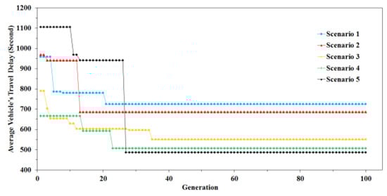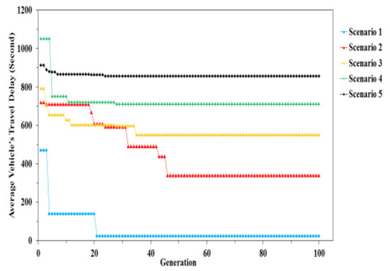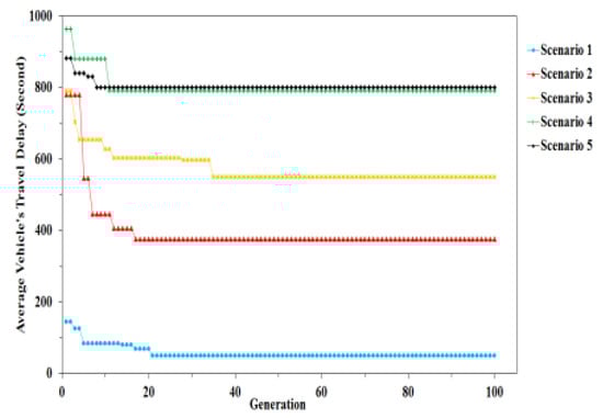 Figure 6 demonstrates the GA search convergence and average travel delay in different scenarios. Obviously, the largest value of travel delay is 724 s (in scenario 1), which is approximately 1.5 times the smallest value (485 s in scenario 5). Of note is the larger safety threshold value set and the smaller average travel delay of the work zone and vice versa. On the other hand, the curves can also be explained by the fact that the speed fluctuation is dependent on the safety toleration of upstream vehicles in reference to formula 3. Therefore, a significant result can be concluded that the traffic safety threshold value has a positive impact on the speed variance of vehicles passing through the designated work zone. Moreover, the VSL strategy is one of the key factors that influences the variance of speed, which should not be neglected.
