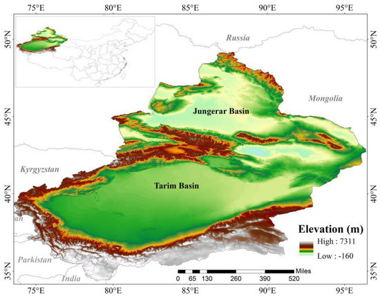 Xinjiang autonomous region (73°–96° E, 34°–50° N) is the largest province and accounts for one-sixth of the national land area in the northwest arid of China (Figure 1). It lies surrounded by the Kunlun, Tianshan, and Altay mountains. The Tien Shan mountain ranges divides the Xinjiang autonomous region into the Junggar and Tarim basins (Figure 1) [43,44]. The economy and population have grown rapidly in the recent years. The gross domestic product (GDP) hit 812.57 billion Yuan, and the GDP per capita reached 34,435 Yuan, which was less than 22% of the national level in 2015 [45]. The population was 23.59 million and urbanization level at 47.23% in 2015. The rapid socio-economic growth caused the huge demand of energy consumptions during 1990–2015. For example, the energy consumption was 659.67 million ton coal equivalent (Mtce) during 2011–2015 [45]. With the socio-economic development, energy consumption will reach new heights in the future. However, the huge demand of energy consumption will result in fast growth of carbon emissions. Xinjiang approximately accounted for 5% of the national total carbon emissions, but only accounted for 1.35% of Chinese total GDP in 2015. Carbon emissions per capita was 22.67 ton/person in Xinjiang, which was 2.7 times the national level in 2015 [9]. Therefore, there are huge challenges and pressures to the carbon emissions reduction while considering the fact that Xinjiang is a resource-dependent economic province, with rapid urbanization and industrialization, and an immense energy demand.