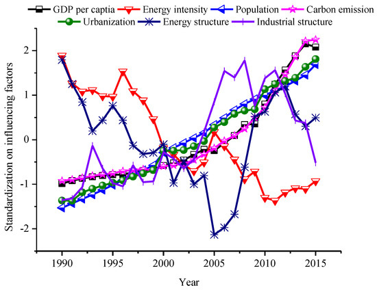Because the metric of each variable are differences, in order to cancel the metric differences, the standardized method (subtracting means and dividing by the standard deviations) is used to handle the data of carbon emissions and influencing factors in Xinjiang. Figure 3 shows the temporal variation of standardized carbon emissions and influencing factors. The trends of carbon emissions and influencing factors can be divided into two stages (Figure 3), namely slow growth during 1990–2004 and rapid growth during 2005–2015. During the period of 1990–2004, China fully carried out the reform and opening up policy. The economic development mode was transformed from planned economy to market oriented economy, and the growth rate of socio-economic development was relatively fast. Since the 1990s, Xinjiang implemented the advantage resource transformation strategy, which accelerated the process of industrialization, and the growth of energy consumption led to sustained increase in carbon emissions, with an average annual growth rate of 5.7%. It can be seen that energy intensity fluctuates obviously from 1990 to 2004. Energy structure and energy intensity increased slightly during 1994–1996, then continued to decline again after 1996. During the period of 1990–2004, carbon emissions and other influencing factors showed a slowly growth trend (Figure 3).