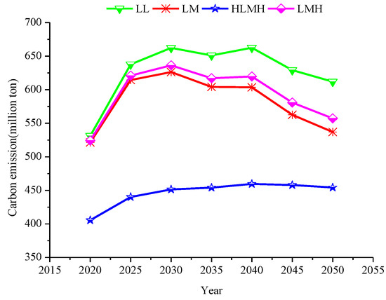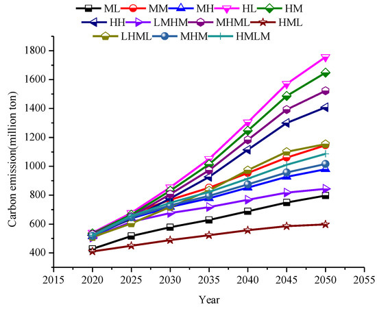 Figure 5 and Figure 6 shows the projection of carbon emissions under 16 scenarios from 2020 to 2050. It can be summarized in three patterns: Peak scenarios at 2030, peak scenarios at 2040, and scenarios without peak. It is clear that there are differences about carbon emissions in the peak scenarios, which could be arranged from small to large as “HLMH”, “L-M”, “LMH”, “L-L” with the peak value of 459.53, 626.21, 636.24, and 662.25 million ton, with the corresponding peak time occurring at 2040, 2030, 2030, and 2040, respectively (Figure 6).