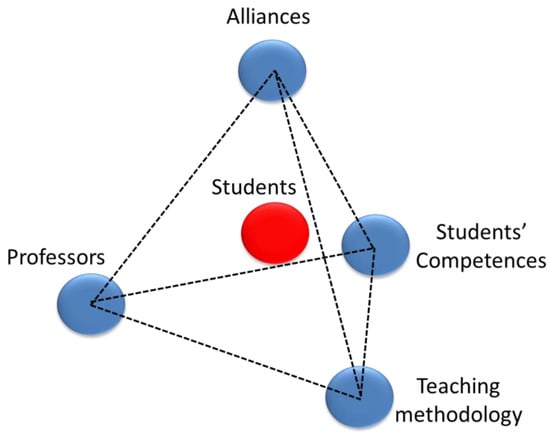 Figure 3 is a graphical abstract of the following reflections that are made on the basis of Section 5 above. We focus and particularize the previous dimensions (Students, Competences, Professors, Teaching methodology and Alliances) in this course, in its academic contents and in its methodological approach.