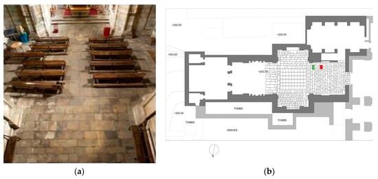 Cristo chapel of Santa María de Conxo Monastery: (a): General image of the chapel pavement and (b): The chapel plant (provided by Raquel Otero) showing the granite slabs; test areas are marked for the traditional tests (in green) and the biological tests (in red).