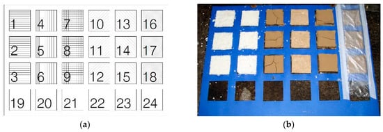 Different contact times, poultices and number of applications were assayed on site. Three types of poultice were prepared (deionized water was added to achieve good consistency and adherence): Pure cellulose (C) (120 mL of H2O to 40 g of cellulose), pure sepiolite (S) (155 mL of H2O to 130 g of sepiolite) and 1:1 cellulose–sepiolite mixture (CS) (110 mL of H2O to 25 g + 25 g of cellulose and sepiolite). Different contact times were tested: 10 min (10), 24 h (24) and 144 h (144), and different numbers of application: 1, 3 or 9. Table 1 and Figure 2 show the six different on-site traditional poultices tests applied (dimensions: 80 × 80 × 5 mm). Between applications a period of 24 h was allowed for the surface to dry before the next treatment. All tests were carried out in triplicate and six control areas were left with no treatment. In order to homogenize the test results, all tests were performed using a mold.