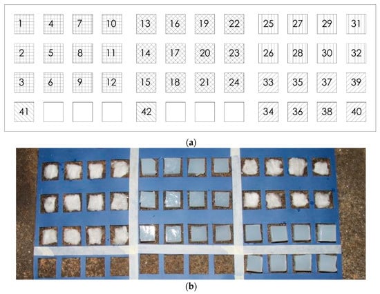 Biological treatments assayed: (a): Scheme of the 42 test assayed (BW: 1–12; BA: 13–24; CW: 25–32; CA: 33–40; Control: 41–42; Treatment times: 3 h: 1–3, 13–15, 25, 27, 33, 34; 24 h: 4–6, 16–18, 26, 28, 35, 36; 48 h: 7–9, 19–21, 29, 30, 37, 38; 72 h: 10–12, 22–24, 31, 32, 39, 40) (b): Image of the treatments applied on site.