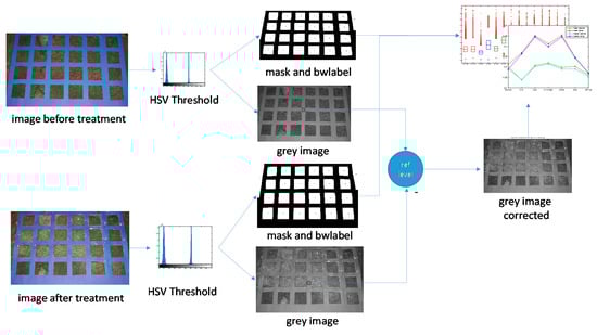 Specifically, image analysis involved a first stage of organizing the results of the photographic control to facilitate processing, selecting the before-and-after images of each treatment. Subsequently, a segmentation of each test area was carried out using morphological processing, obtaining their masks, numbering and location, in order to determine and store the pixels that made up each test area in a results structure. Next, the grey levels of each pixel of each test area were analyzed and quantified, selecting a number of pixels common to each test area to analyze the pixels that could be representative and comparative between tests. A luminosity correction of the images was carried out to homogenize the test areas between the images before and after the treatment. Finally, the results obtained were shown by means of different graphical representations. Median, standard deviation and outliers of each test area were calculated for each treatment replica (three test areas/replica/treatment). Comparative results were determined by calculating the differences in grey value before and after each treatment, compensating for the control median value.