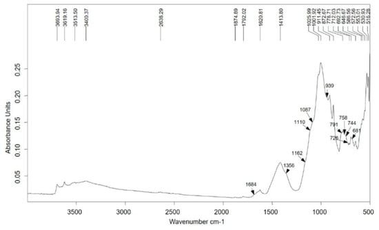 The main chemical composition of the pavement obtained by FTIR analysis (Figure 5) was quartz (1161 cm−1, 1087 cm−1, 793 cm−1, 776 cm−1, 693 cm−1), feldspar (1055 cm−1, 1161 cm−1, 1001 cm−1, 939 cm−1, 758 cm−1, 744 cm−1, 646 cm−1), calcite (1425 cm−1, 876 cm−1, 712 cm−1), Kaolinite group minerals (3693 cm−1, 3619 cm−1, 911 cm−1) correlating with granite stone. Infrared spectra also showed the presence of gypsum (3484 cm−1, 3400 cm−1, 1618 cm−1, 1684 cm−1, 1484 cm−1, 1119 cm−1, 607 cm−1) probably from the grout mortar. Peaks characteristic of nitrate (1356 cm−1) were also found.
