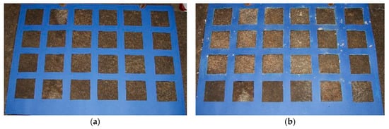 Images detailing the surface test areas: (a) Before treatment; (b) after biological treatments and controls assayed.