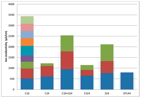 Ion conductivity mean results of different poultices (C: Cellulose, S: Sepiolite, SP: Sepiolite and plastic film); contact times (10: 10 min, 24: 24 h, 144: 144 h); and applications (blue: First, red: Second, green: Third, purple: Fourth, turquoise: Fifth, orange: Sixth, blue-purple: seventh, rose: Eighth, pale green: Ninth).