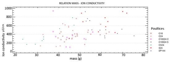 In order to check whether the mass of the poultice is a critical factor in desalination, a mass-conductivity analysis of the different poultices applied was carried out. The results show no linear correlation between mass and ion conductivity (Figure 8), indicating that salt absorption is independent of the mass of the poultices used. This result agrees with other authors, who suggest that the ion conductivity must be related to the surface area but not to the mass of the poultice used []. Therefore, extraction efficiency must be dependent mostly on the material used for the poultice, the contact surface and the application times.
