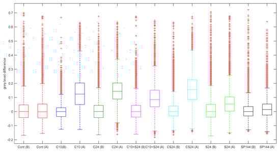 Boxplot showing median, standard deviation and outliers of the different traditional treatments assayed, adjusting all the values with the control median before treatment. From left to right in before (B)-and-after (A) treatment pairs: Control, C10, C24, C10 + S24, CS24, S24 and SP144.