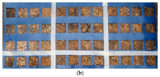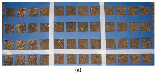 The cleaning (reduction in dark staining) of the in-situ tests was estimated by digital image analysis. Digital images were taken before and after the treatments. In order to standardize the images, a tripod with a fixed condition (ISO100, f/8.0, 1/250 s, focal length 19 mm) digital camera (Canon EOS 50 D) was used. In order to facilitate the digital image processing, a template of blue cardboard surrounding the test area was used (see Figure 2 and Figure 3).