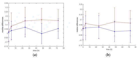 Digital analysis of median differences of the biological treatments (upper, red) and their controls without bacteria (lower, blue): (a) Using cotton wool as delivery system; (b) using agar 2% as a delivery system.
