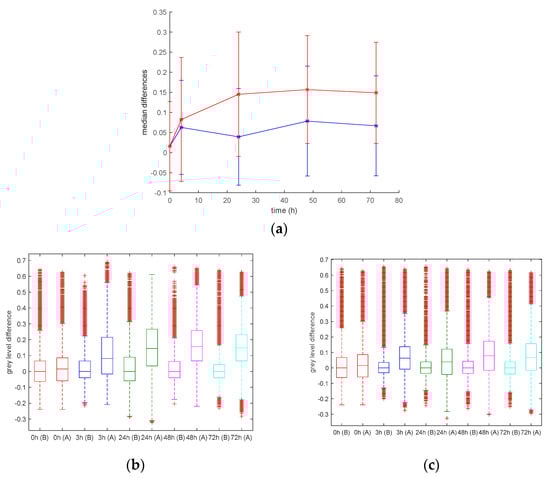 Digital analysis values of the biological cleaning treatments: (a) Comparison of both cleaning delivery systems with treatment time: P. stutzeri and cotton wool (upper, red) and P. stutzeri and agar 2% (lower, blue); boxplots showing before and after medians, standard deviations and outliers of the different treatment times with: (b) Bacteria and cotton wool; and (c) bacteria with agar 2%.