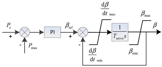 The deviation between the actual active power and the D-PMSG maximum power is used to perform the PI operation and calculate the pitch angle reference value [38]. is the servo time constant, and are the pitch angle amplitude limits, and are the pitch angle speed limits, β is the output pinch angle.