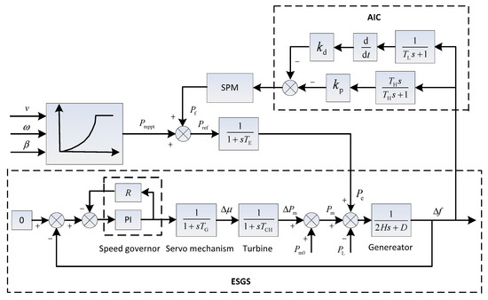 where is the auxiliary power of AIC; denotes the frequency deviation, , and are measured values and the reference value of the system frequency, respectively; and are the proportional and derivative coefficients, respectively, , in practical application. A high and a low pass filter are also added to the AIC module respectively. The speed protection module (SPM) ensures the wind turbine exits the AIC when the rotor speed is lower than 0.67 and prevents the speed from being too low and causing cutting machine accidents [41].