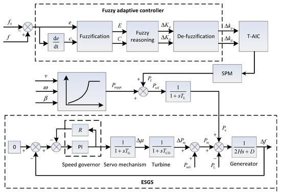 Thus far, the robust adaptive control techniques have been developed to deal with changes in system parameters. The applications of neural networks, genetic algorithms, optimal control and model predictive control (MPC) for the frequency control have been reported in [27,28,29,30]. Compared with the abovementioned methods, the fuzzy logic control displays better performance, such that there is no need for accurate mathematical models, robustness against load disturbances and parameter uncertainty. The fuzzy logic methodology is a practical control method which has been widely applied in research on frequency control with and without nonlinearities [31]. The paper [32], proposed a parameter adaptive PID-Type fuzzy controller in a wind-diesel power system to improve the frequency performance. The paper [33], applied the artificial bee colony algorithm based on the fuzzy-logic controller to maintain the system frequency in a high wind penetrated power system within a normal operating band. In [34], a novel fuzzy theory-based coordinated control strategy was proposed for improving the short-term frequency response capability of a DFIG-energy storage (ES) system. Since the T-AIC model for the D-PMSG wind turbine is nonlinear and the relations between the proportional/derivative coefficients and the frequency deviation under wind speed or load disturbances are complicated, the fuzzy logic control method is chosen as the adaptive controller in this paper.