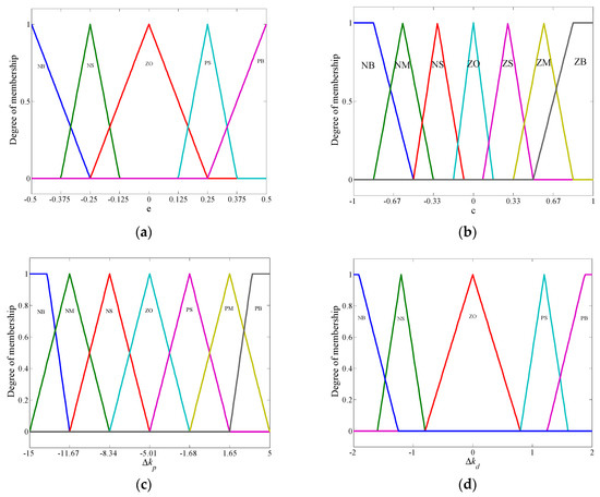 The membership functions of the inputs and outputs. (a) The membership function of e; (b) The membership function of c; (c) The membership function of ; (d) The membership function of .