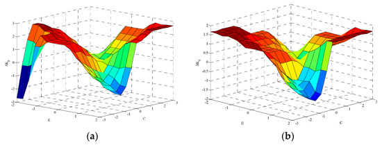 The system frequency reference value is 50 Hz in this paper, and the primary frequency regulation range of the grid-connected system is set to ±101%, that is, 49.5 Hz~50.5 Hz, so the frequency deviation range is set as . The frequency deviation change rate after discrete sampling is set as . In order to ensure a certain reserved margin, based on the initial values of the proportional and derivative coefficients, the basic domain of outputs and are set as [−15, 5] and [−2, 2].