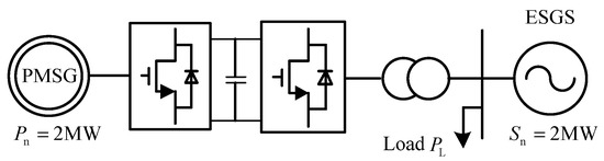 As the main steam of renewable energy, wind power has become the fastest-growing new energy and will be a major source of electrical power in the near future [1,2,3]. Recently, the widely used variable-speed wind turbine generators (WTGs) can be classified as two types: The doubly-fed induction generator (DFIG); and the directly-driven wind turbine with the permanent magnet synchronous generator (D-PMSG). The D-PMSG has become the dominant model in the wind power market due to the advantages of high efficiency, high reliability, competitive costs and wide operating ranges [4,5,6]. At present, the D-PMSG usually operates in maximum power point tracking (MPPT) control mode for maximum wind energy through the full power converter. However, owing to the rotor speed of PMSG and the decoupling of the system frequency in this control mode, the active power can only be adjusted according to the rotor speed and wind speed without responding to the system frequency deviation. Therefore, D-PMSG cannot provide additional active power to participate in grid frequency regulation. The large-scale wind power integration inevitably leads to the lower system inertia and larger system frequency fluctuations during load disturbances [7,8,9]. Therefore, it is of great theoretical and practical significance to study the frequency control strategy and improve the ability of actively participating in grid frequency regulation for D-PMSG.