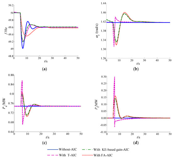 In the T-AIC mode, the system frequency change rate decreases and the minimum value raises from 49.01 Hz to 49.22 Hz and the time for the system frequency minimum value extends from 6.96 s to 6.99 s. In the KE-based gain-AIC mode, the system frequency minimum value is 49.21 Hz, which is smaller than the T-AIC 0.01 Hz. This is because in the KE-based gain-AIC mode, the proportional and derivative coefficients are adjusted depending on the units’ initial rotor speed. The lower the rotor speed, the smaller the coefficients are, so the proportional and derivative coefficients in the T-AIC mode are larger than those in the KE-based gain-AIC. However, in the case of the FA-AIC, due to the introduction of the fuzzy adaptive controller, the two coefficients can be adjusted based on the frequency deviation and the frequency deviation change rate caused by the load disturbance, so the system frequency minimum value is further increased to 49.36 Hz and the time to the minimum value prolongs to 10.0 s. However, the system frequency steady-state response is hardly improved. Obviously, the system frequency dynamic response is improved significantly with the T-AIC, KE-based gain-AIC and the FA-AIC. In addition, compared with the T-AIC and the KE-based gain-AIC, the FA-AIC improves more. It can be seen that the FA-AIC theme can provide effective inertial support to improve the system inertia response and reduce the frequency change rate at the initial stage of the load disturbance.