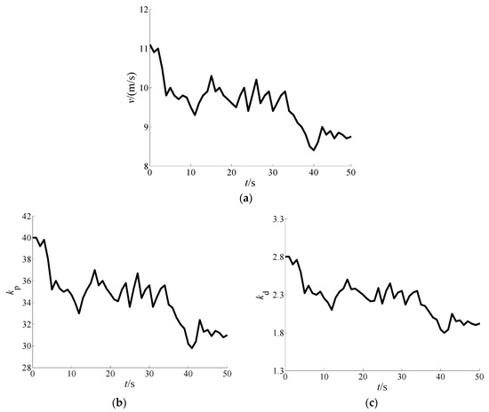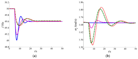 This case refers to the system inertial response when the active power of the load suddenly increases 0.4 MW in the first 20 s under the condition of random wind speed in 7~12 m/s. The other relevant parameters remain constant. The random wind speed waveform within 50 s is shown in Figure 11a.