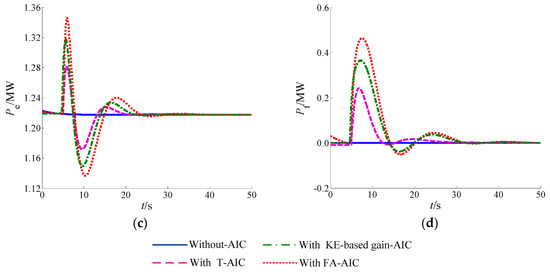 Figure 9b–d compare the dynamic responses of the wind turbine speed , the wind turbine output active power and the auxiliary power thereunder the four control modes after the load suddenly increases. The D-PMSG operates in an optimal speed and an output power under the without-AIC mode. In case of the T-AIC, the proportional and derivative coefficients are the tuned initial values and relatively large, so the rotor speed decreases quickly and the auxiliary power increases rapidly in order to increase the wind turbine output power to participate in the system frequency regulation. However, the speed protection module (SPM) starts action and the AIC exits immediately when the rotor speed is less than 1.31 rad/s (0.67 ), the auxiliary power drops instantaneously and approaches to zero gradually. After that, the rotor speed returns to the optimal value thinly, that would cause the system to absorb electromagnetic power from the power grid and affect the system frequency response. In the KE-based gain-AIC mode, when the rotor speed is equal to the minimum value, and the two coefficients are zero, the unit does not provide inertial support and avoids the unit being off-grid. In the FA-AIC mode, the two coefficients and the auxiliary power are adjusted based on the frequency deviation and the frequency deviation change rate which avoid the frequency over-modulation for the wind turbine at low wind speeds. A comparison of the FA-AIC with the KE-based gain-AIC shows that the wind turbine speed is further reduced and the active power increases by 0.02 MW instantaneously after the load suddenly increases, and the rotor speed and the output power change smoothly overall.