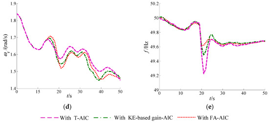 Under the variation in wind speed, the proportional and derivative coefficients and are as shown in Figure 11b,c, and the appropriate control coefficients can be obtained according to the frequency deviation. Figure 11d indicates the rotor speed in three control modes under random wind speed and the load sudden disturbance. It can be seen that the D-PMSG wind turbine rotor speed with the KE-based gain-AIC and the FA-AIC are lower compared with the T-AIC, so more auxiliary power can be provided to support the system frequency. Figure 11e illustrates the comparisons of the system frequency response. Obviously, with the introduction of the KE-based gain-AIC and the FA-AIC, the system frequency can be smoothed by adaptively regulating the two coefficients to suppress the frequency fluctuation. When the load suddenly increases at 20 s, the system frequency minimum value with the T-AIC falls to 49.23 Hz and the ones with the KE-based gain-AIC and the FA-AIC rises to 49.49 Hz and 49.60 Hz respectively. The dynamic frequency deviation decreases greatly with the KE-based gain-AIC and the FA-AIC. In addition, compared with the KE-based gain-AIC, the FA-AIC improves more in the system frequency change rate and the minimum value at the initial stage. Obviously, the proposed FA-AIC strategy can not only suppress the frequency fluctuation caused by the variation in wind speed, but also provide rapid and effective frequency support during a load disturbance.
