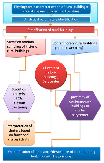 - Selection of the historical and contemporary buildings samples used (Section 2.2). In fact, appropriate sampling approaches were adopted in order to select a significant and representative number of buildings to be analyzed in detail as study cases over a sub-regional territory considered for the experimental application of the developed methodology.