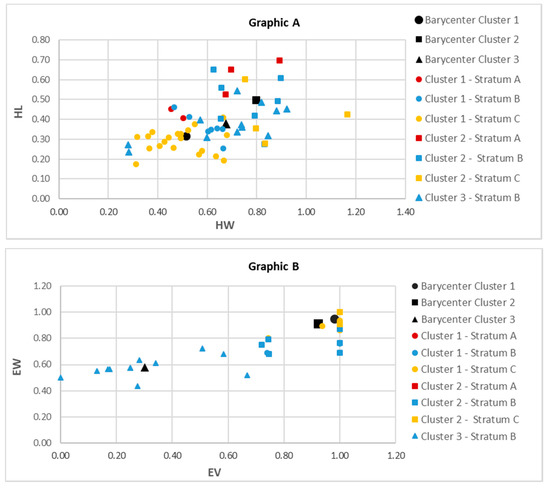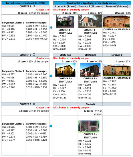 - stratum B has very variable formal characteristics, since the sample is distributed in all three clusters, with greater and exclusive representation in cluster 3). It is characterized by rectangular plan shapes that can be either flattened to the ground (cluster 1) or slender (cluster 2) in relation to the height, but always with a permeability-though partial-towards the landscape for EV ≠ 1 and EW ≠ 1. The following cases can be identified: buildings with ground floor walls along the entire perimeter and open loggias on the first floor (Figure 6. cluster 1-stratum B), a little portions of build whit a full-height porticos, which can be completely or partially closed, or cases where EV ≠ 1 and EW ≠ 1 are greater than 0.7 so that the buildings have a perimeter portion open at least on two (Figure 6. cluster 2-stratum B), or even fully open volumes or small portions of closed volumes, with two or more infilled perimeter sides (Figure 6. cluster 3-stratum B). Cluster 3, in particular, includes historic buildings with original function of barns: initially characterized by empty volumes and just one or two infilled perimeter walls, over time have partially closed the volumes in order to be able to serve as sheltering tools as well.