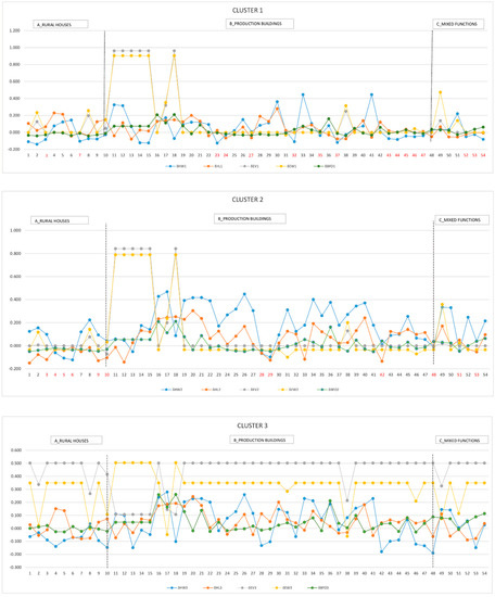 - for multiple parameters (23/54 on the total sample): a dissonance is confirmed for both the proportion and the opening and closing of the building compared to the landscape defined for cluster 1. For example, case nr. 49, a building destined for a receptive activity linked to a winery, commissioned with the aim of evoking a building of the past, has in contrast dissonance with historical characters both by proportions, since the parameters show a flattened perception of the building on the ground, and by compactness of the volume with a perimeter permeability different from the historical rural characters of the study area. Also, for cluster 2 there are positive peak values of EV and EW parameters confirming the presence of completely open and permeable buildings to the landscape.