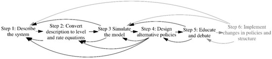 Our research follows the iterative process in Figure 1, which characterises that the system dynamics combine aspects of qualitative and quantitative research []. The first five steps are relevant for the purposes of the research as the implementation of changes (sixth step) constitutes a farmer’s responsibility.