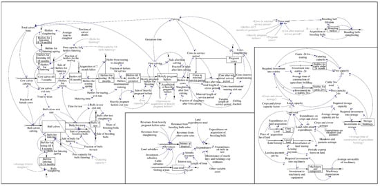 Figure 3 shows the SFD of the main subsystems of beef cattle farming. This phase requires parametrisation, and thus collecting data from farmers. Many small farmers take the opportunity of high flat-rate taxation, which makes accounting simpler. However, it results in a lack of data on the economic subsystems of the given farms. The top part of Figure 3 shows the core of a farm and our model—the structure of the herd, which is represented by only one variable in Figure 2, is developed into the form of two interconnected ageing chains. Such a disaggregation of variables representing the herd structure has two reasons. Firstly, it increases the trust of the farmers in the simulation model as they can see that the modelling structure represents the main characteristics of their herd. Secondly, the time series data on the livestock structure are usually well documented. Therefore, it is possible to test the quality of the model on this subsystem and calculate the missing parameters.