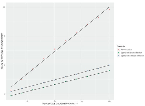 To avoid the instability and oscillation of the herd structure [,,], the optimal purchases of the heavily pregnant heifers were limited by the culling fraction (7%). The objective function was set to maximise the aggregated cash flow revaluated to prices of 2016. The course of the optimal purchases of the heavily pregnant heifers according to the percentage growth of the farm’s capacity is in Figure A2 and Figure A3. For these scenarios that evaluate the future development, we revaluate the parameters that express the prices of inputs and outputs by the 10-year average inflation (1.9%) [].