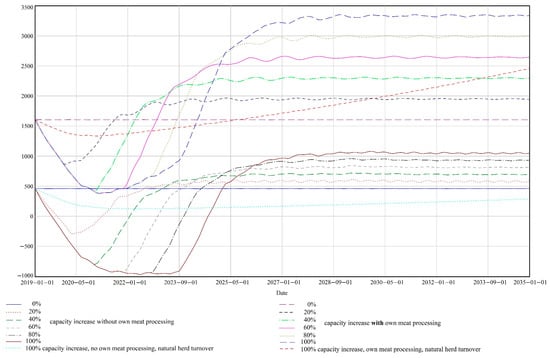 Figure 5 shows the development of the cash flow under selected extension scenarios. The scenarios differ in percentage extension of the farm capacity (0%, 20%, 40%, 60%, 80%, and 100% increase) and evaluate the situation from the perspective of the common farm and the farm that diversifies into direct sales of the meat to final consumers. The graph is visibly divided into two parts, where the higher bunch of lines describes the development of cash flow in conditions of own meat processing the lover part represents the situation when the farm sells the cattle to the slaughterhouse. For comparison, the graph contains two lines representing the 100% increase of the capacity with natural herd turnover.