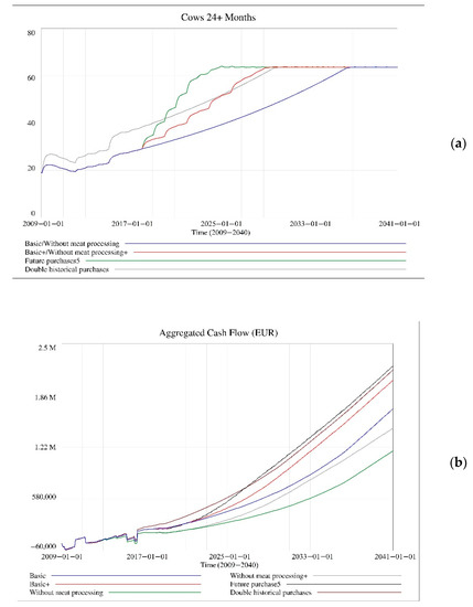 The comparison of the scenarios arises from the accumulation of cash flow measured in EUR/month respectively aggregated cash flow measured in EUR. Table 3 summarizes the list of scenarios presented and compared for the case study. The last column contains the difference between basic scenario (farmer realises the direct distribution to the final consumers, but does not buy other heifers) with other simulated scenarios. The constant difference is caused by the late capacity utilisation, and the variable difference is caused by the different strategies, where the farm outputs can’t reach the same levels. Figure 6 shows the two main indicators that represent the performance of the farm under the conditions of the six scenarios—the number of cows older than 24 months (Figure 6a), which represents livestock and main production capacity and aggregated cash flow before the subtraction of farmers’ family earnings (Figure 6b).