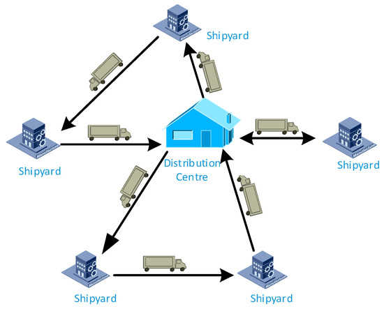Schematic diagram of vehicle routing problem between steel the distribution center and shipyard.