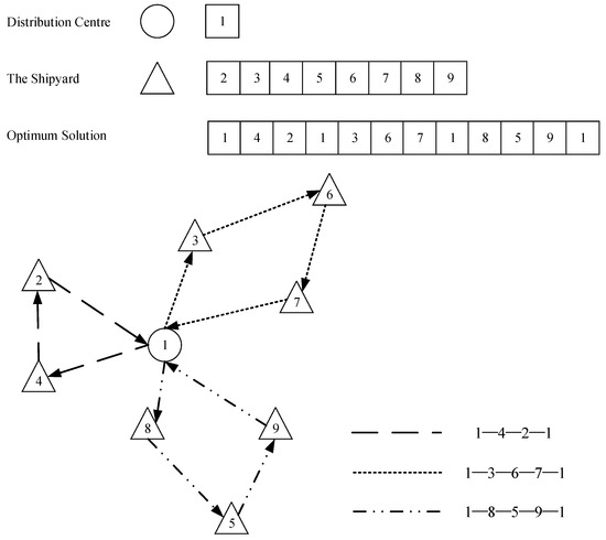 Equations (6)–(8) guarantee that each shipyard can only be served once. Equation (9) indicates that when the vehicle starts from the distribution center, the weight of the cargo on board from all the visited shipyards is zero. Equation (10) denotes the weight of cargo obtained from all visited shipyards on board after vehicle arrives at shipyard to complete the loading and unloading task. Equation (11) denotes the total amount of cargo to be distributed by all subsequent shipyards on board when vehicle departs from the distribution center. Equation (12) denotes the total amount of cargo to be delivered by all subsequent shipyards to be visited after the arrival of vehicle at shipyard , and Equation (13) denotes that the total amount of cargo carried by each vehicle cannot exceed the maximum capacity of the vehicle. Equation (14) guarantees that the same vehicle arrives and leaves each shipyard. Equation (15) indicates the time when the vehicle arrives at the shipyard. Equation (16) ensures that the arrival time of vehicle at the shipyard is not earlier than the earliest time window required by the shipyard, and that the arrival time at the shipyard and the completion of unloading are not later than the latest time window required by the shipyard.