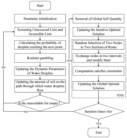 The intelligent water drop algorithm is an algorithm that simulates the movement of water drops in nature and finds the best path. Each water drop simulates the movement of a car. Each drop starts from the distribution center, chooses the next accessible node from the unavailable list, and updates the weight of the goods carried by the vehicle. When the weight of the water drops exceeds the vehicle load or all accessible nodes are visited, the water drops return to the distribution center, which constitutes a completed vehicle route. The next intelligent water drop starts to run until all nodes are visited and completed in an iteration. Traditional intelligent water drop algorithms tend to converge slowly and often fall into a local optimum. In order to avoid this situation, an improved Intelligent Water Drop (IIWD) algorithm was designed. Elite strategy and variable neighborhood search mechanisms were added to effectively ensure that the algorithm jumps out of local optimum and avoids falling into a premature optimum.