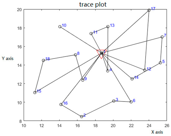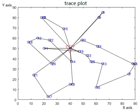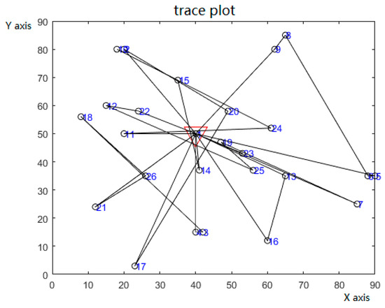 The simulation results show that the improved intelligent water drop algorithm has faster convergence speed and higher efficiency than the traditional intelligent water drop algorithm when solving the GVRSP-SPDTW problem, as shown in Figure 4. This is because the improved algorithm can reset and insert some nodes of the better solution after iteration, which can overcome the problem of long search time of the traditional intelligent water drop algorithm and effectively avoid the shortcoming of falling into local optimum in the search process. When the total number of iterations is 23, the optimal solution of the model can be obtained. At this time, six vehicles are allocated. The specific allocation scheme and vehicle routing are shown in Table 4. The Figure 5 and Figure 6 are diagrams of the optimal routes of the two algorithms.